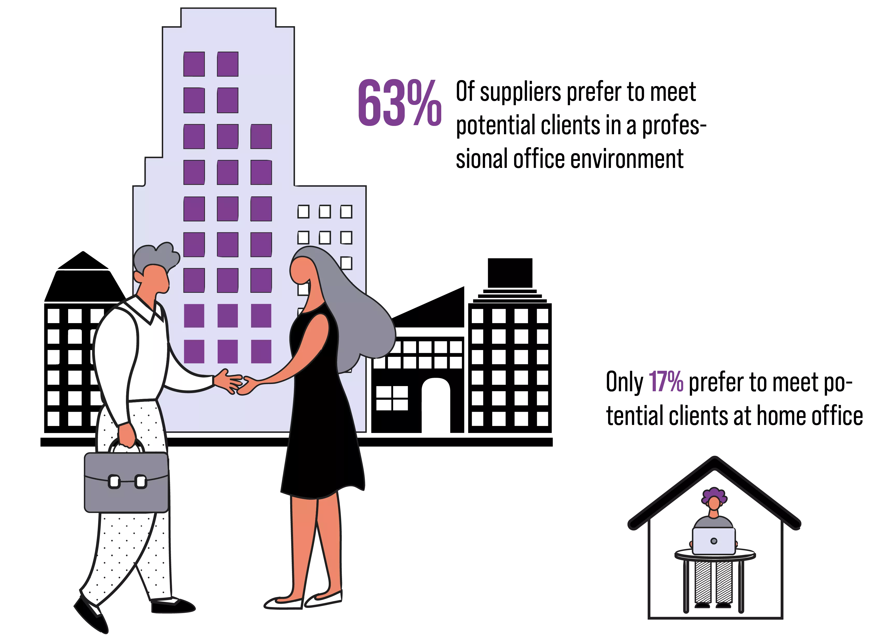 وجدنا أنه على الرغم من أن الاجتماع في بيئة مهنية هو الطريقة الأفضل والأكثر أمانًا للموردين للقاء العملاء المحتملين، إلا أن الآراء حول أماكن الاجتماعات الأخرى خارج المكتب قد تغيرت على مدار السنوات الخمس الماضية. فمستقبل العمل في الوقت الحالي يستلزم أماكن عمل مختلطة مقبولة بدرجة أكبر، حيث تشير أكثر من ٧٠٪ من الاستجابات إلى أن الاجتماع في مقهى في عام ٢٠٢١ لا يؤثر سلباً على اختيار مورد محترف.